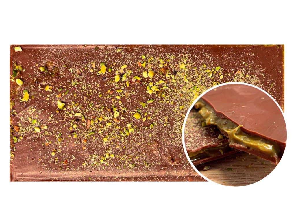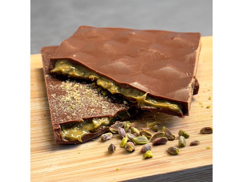 Lehce křupavá pistáciová náplň v tenké vrstvě mléčné čokolády. Každý kousek je plný intenzivní pistáciové chuti, která tě dostane. Vyzkoušej a uvidíš!